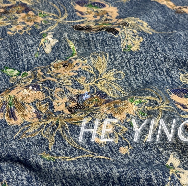 Premium denim embroidered with clean edges and balanced sparkle—designed for modern womenswear pieces that stand out without trying too hard.
